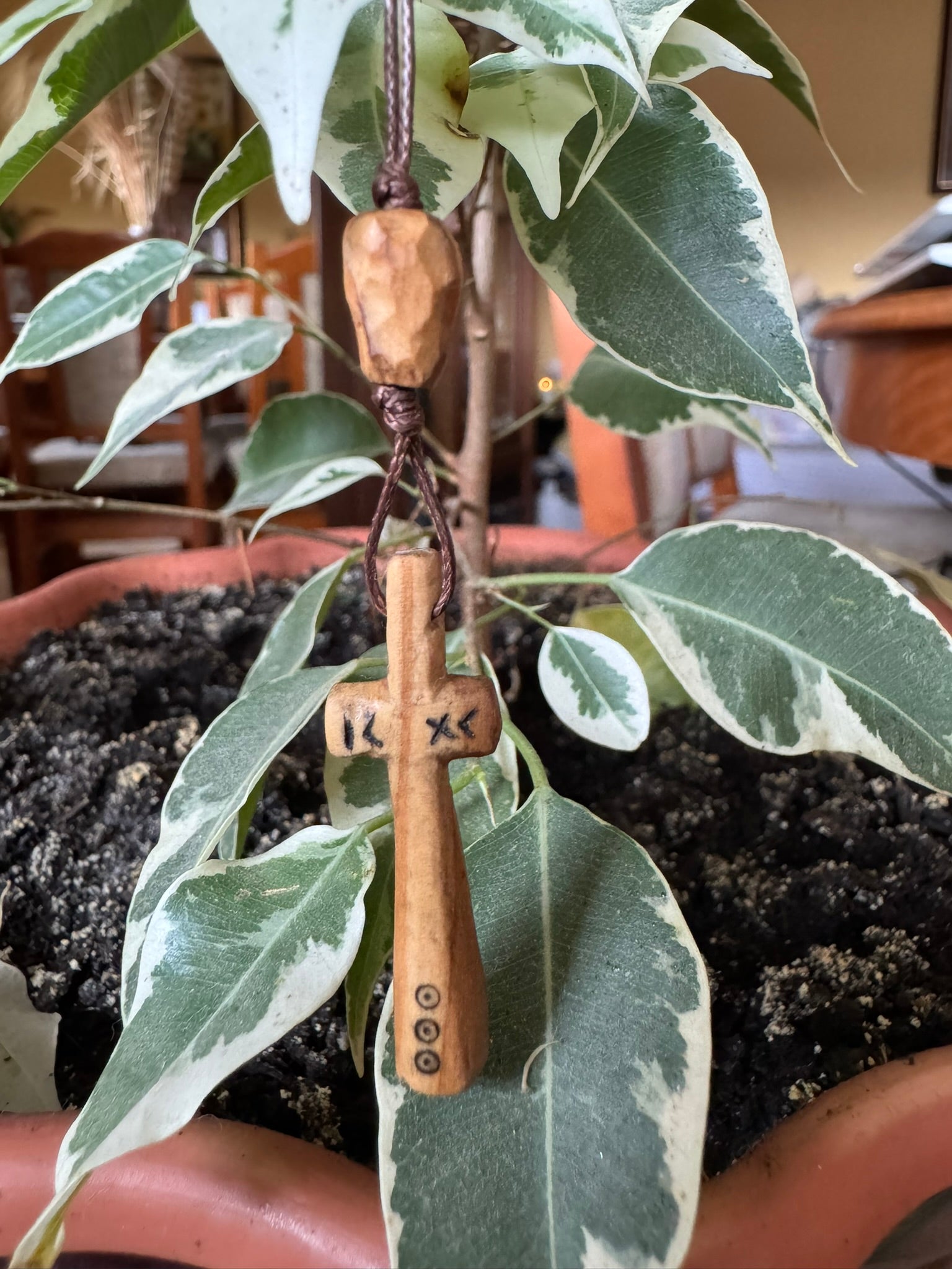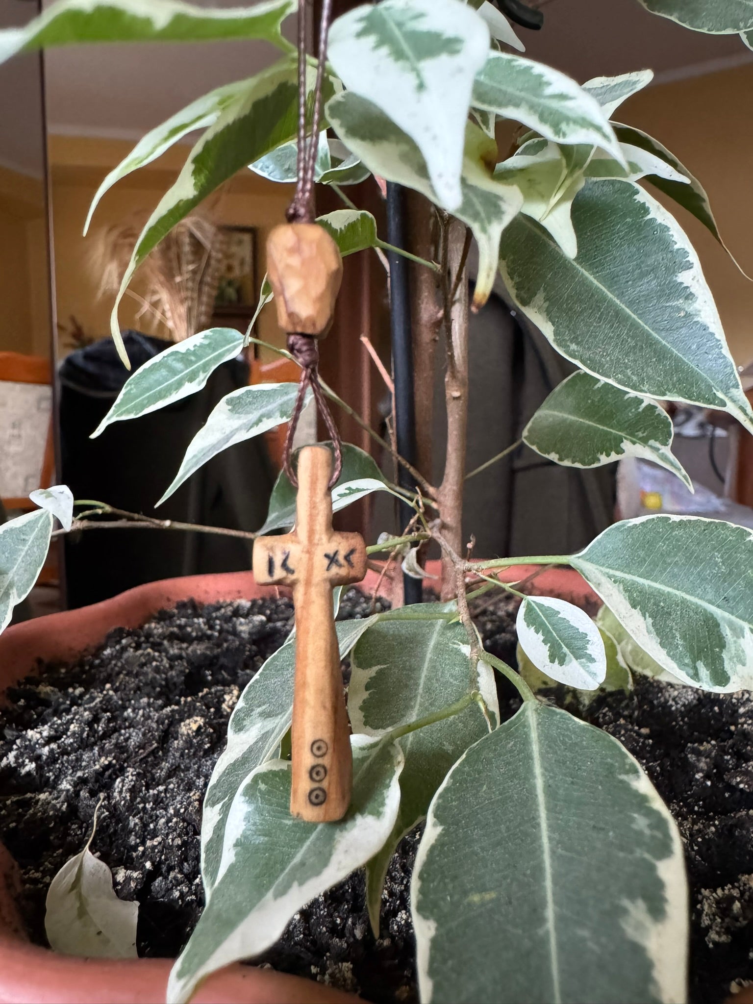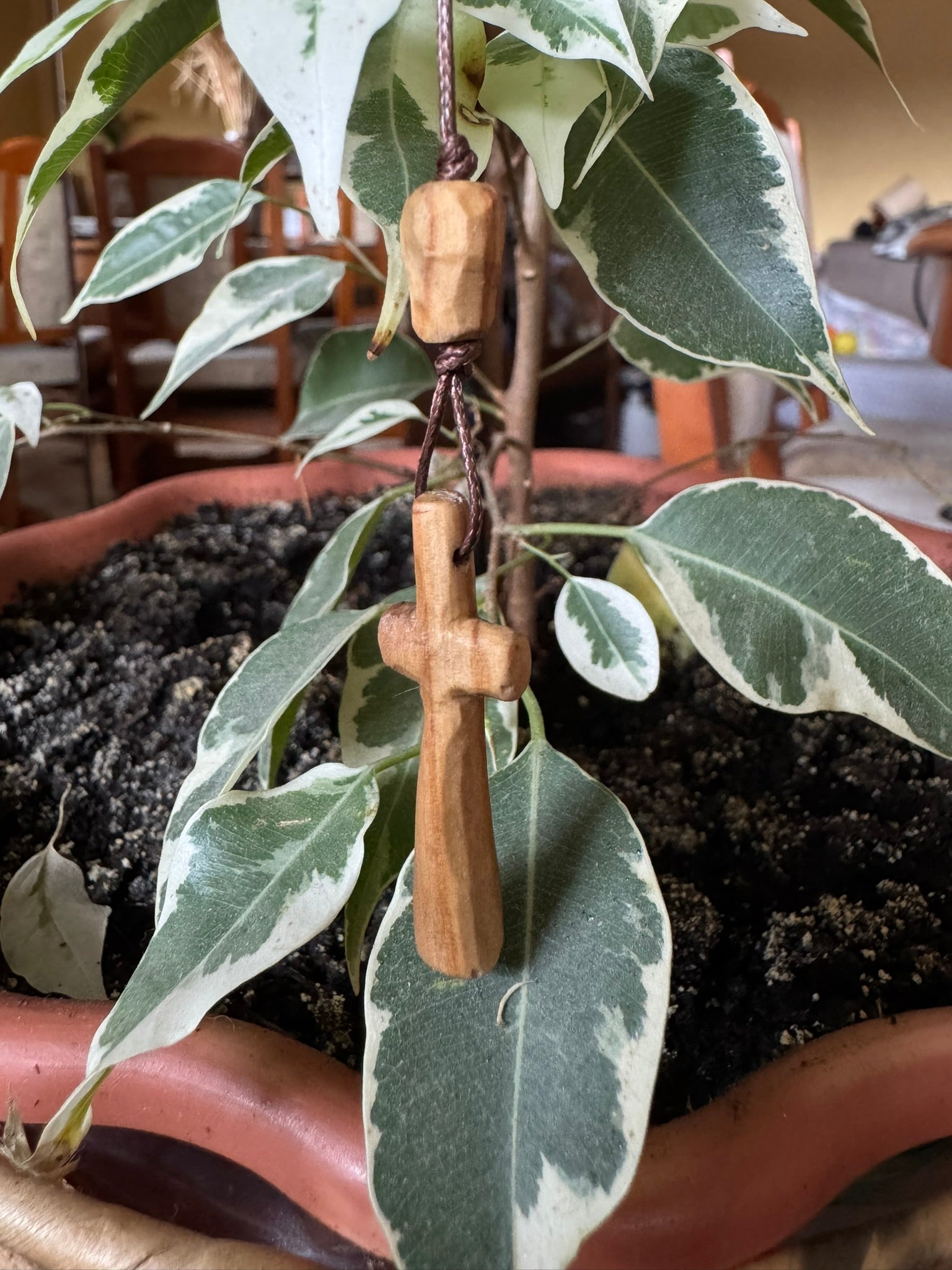 Cruciuliță din lemn de măslin lucrată manual, realizată cu atenție la fiecare detaliu. Atât crucea cât și elementul de legătură sunt lucrate manual, fiecare piesa fiind unică.